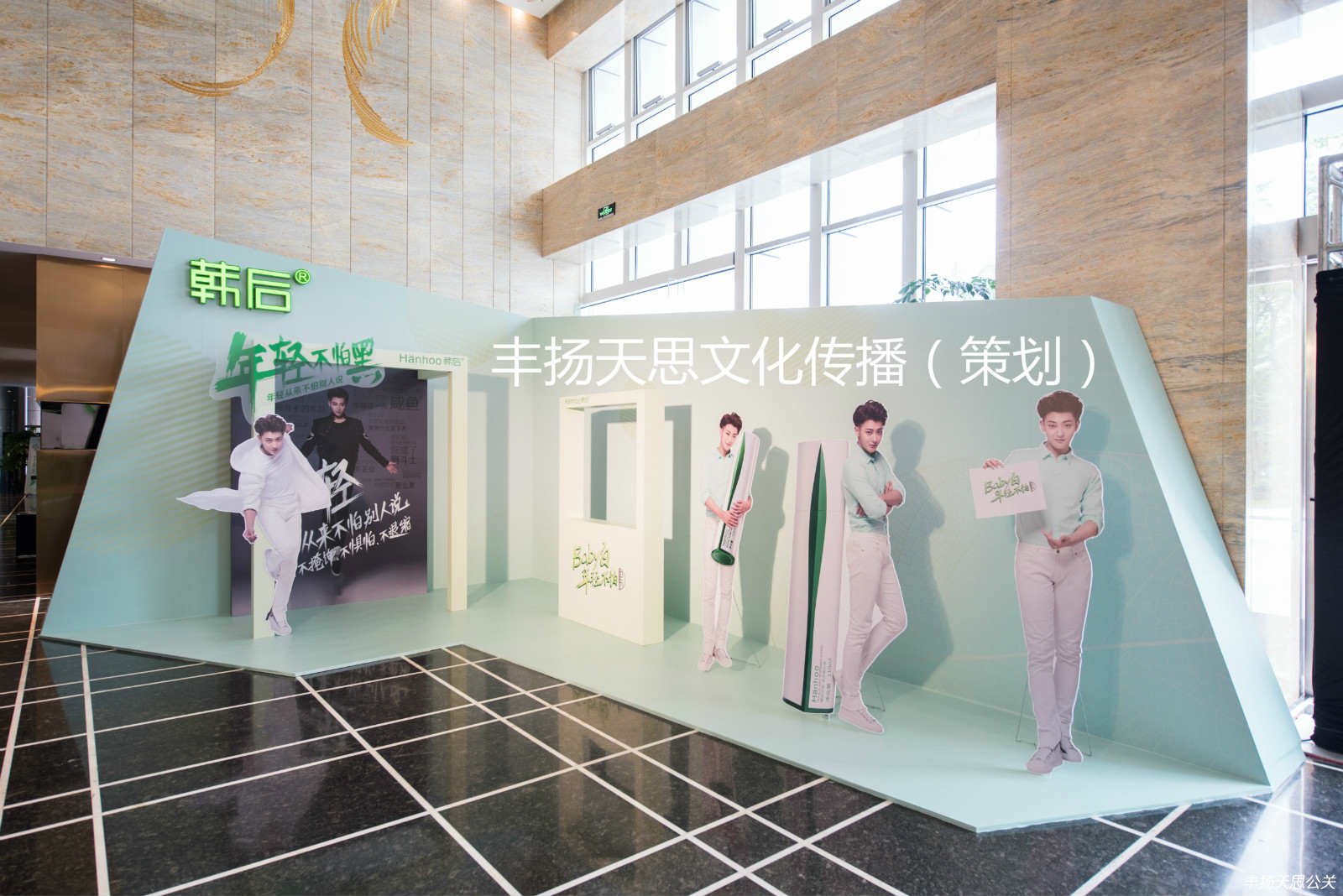 繼韓后請一系列代言人后,現如今的小鮮肉品牌代言,凸顯了韓后品牌打入年輕消費群的決定。為此,豐揚天思在韓后大會門口擺放了代言人黃子韜的形象,配以綠色清新的色彩,讓人在夏日心曠神怡,并且代表了年輕化的思想。